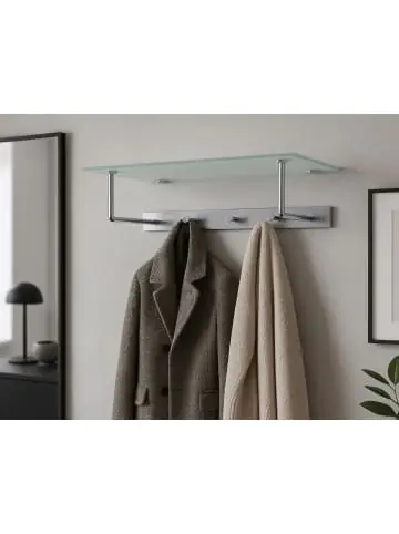 Moderne Wandgarderobe mit Glasablage – Funktionalität trifft Design. Diese funktionelle Wandgarderobe ist die ideale Lösung für Ihren Flur, Eingangsbereich oder die Diele. Mit ihrer kompakten Form (Maße ca. B 61 x H 18 x T 30 cm) bietet sie maximale Ablagefunktion auf kleinem Raum – perfekt für stilbewusste Haushalte mit wenig Platz.Produkt-Highlights: Robustes Metallgestell – pulverbeschichtet in edlem Alu-Finish 3 verchromte Kleiderhaken für Jacken, Taschen oder Schals 2 verchromte Kleiderstangen – ideal für Bügel oder zusätzlichen Stauraum Ablagefläche aus Sicherheits-Milchglas – stilvoll und pflegeleicht Platzsparende Wandmontage – perfekt für kleine RäumeIdeal für moderne Einrichtungen: Die Kombination aus verchromten Elementen, Sicherheitsglas und klaren Linien macht diese Garderobe zu einem echten Hingucker. Sie passt perfekt in moderne, minimalistische oder skandinavische Wohnkonzepte.- Platzsparendes Design: Ideal für kleine Flure, Dielen oder den Eingangsbereich – Maße ca. B 61 x H 18 x T 30 cm- Hochwertige Materialien: Robustes Metallgestell, alufarben pulverbeschichtet, mit verchromten Elementen- Vielseitige Aufhängemöglichkeiten: Ausgestattet mit 3 verchromten Kleiderhaken und 2 verchromten Kleiderstangen- Praktische Glasablage: Obere Ablagefläche aus stabilem Sicherheits-Milchglas für Accessoires, Taschen oder Hüte- Modernes Design: Stilvolle Wandgarderobe in zeitloser Optik – kombinierbar mit modernen Wohnkonzepten