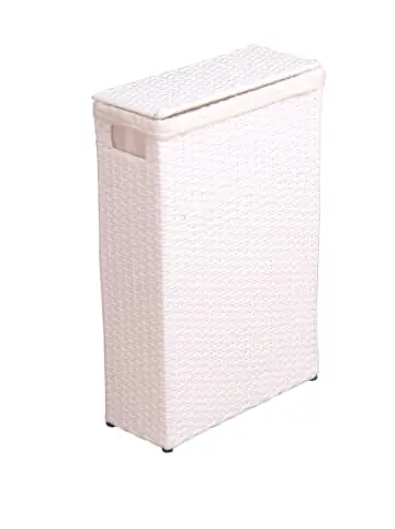 Dieser praktische, handgeflochtene Raumspar-Wäschekorb ist mit pflegeleichten Polyrattan in weiß lieferbar. Ideal für kleine Räume und manche, ungebrauchte Nische wird optimal ausgenutzt. Mit aufklappbarem Deckel, zum Schutz ihrer Wäsche mit einem herausnehmbarem, cremefarbenen Wäschesack (100% Polyester) ausgestattet, bei 30°C waschbar. Stabiles Gestell aus Eisen, Ohne Dekoration. Maße ca. cm: B. 16 x H. 60 x T. 39- Nur ca. 16 cm breit- Handgeflochten- Inklusive herausnehmbaren Wäschesack