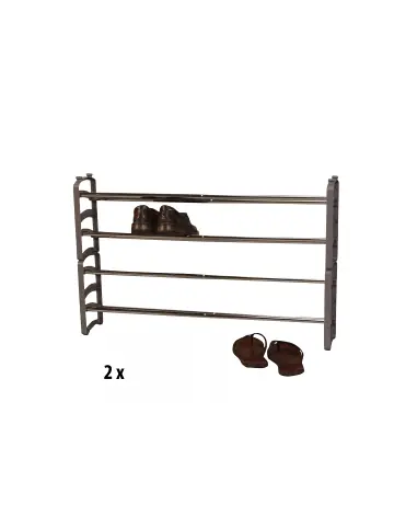 Praktisches Schuhregal mit Seitenteilen aus Kunststoff, die wahlweise schwarz, weiß oder grau eingefärbt sind. Jeweils mit verchromten, ausziehbaren Stahlrohren, auf denen je Etage ca. 5 Paar Schuhe Platz finden. Im Lieferumfang sind insgesamt 4 Regale mit jeweils 2 Etagen, die nebeneinander gestellt werden können, oder praktisch übereinander zusammengesteckt werden. Die Regale werden zur Selbstmontage, inklusive Aufbauanleitung angeliefert. Maße je Regal ca. cm: (B/H/T) 58-104/33/18.- Pflegeleichte Oberflächen- Platz bis zu 40 Paar Schuhen- Stapelbar oder nebeneinander stellbar