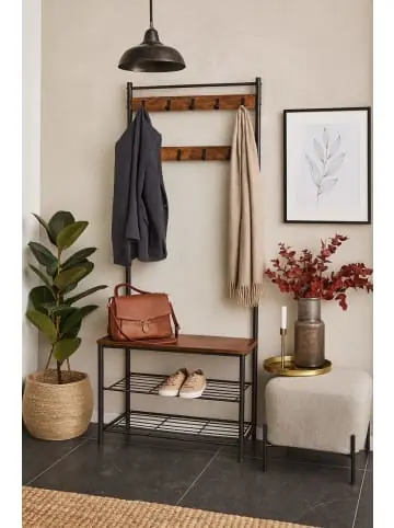 Moderne Garderobe aus Stahlrohr, schwarz pulverbeschichtet. Unten zwei Gitterablagen, darüber Sitzfläche aus Holzwerkstoff, holzfarben antikbraun, beschichtet. Oben zwei Leisten aus Holzwerkstoff, ebenfalls antikbraun, beschichtet, mit insgesamt 9 Metallhaken, bestückt. Lieferung der Garderobe erfolgt zur Selbstmontage, inklusive Aufbauanleitung. Maße ca. cm: (B/H/T) 70/32/177 cm. Sitzfläche ca. 47 cm, 70 cm breit, 30 cm tief. Stellfläche der Gitterablagen jeweils ca. cm: (B/H/T) 64/17/30.- Mit Sitzfläche- Aus Stahlrohr- Gesamthöhe ca. 177 cm