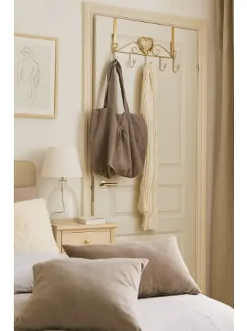 Romantische Türgarderobe aus Metall, goldfarben beschichtet, zum Einhängen auf alle handelsüblichen Türen. Mit schöner Verzierung und Herz in der Mitte. Die 5 Kleiderhaken sind mit geschliffenen Glas-Dekoknöpfen bestückt. Maße ca. cm: (B/H/T) 45/26/6.- Aus Metall- Pflegeleichte Oberfläche- Passend für Türen- Zum Einhängen