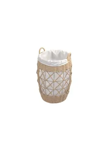 Moderner Wäschekorb mit einem stabilen Eisenrahmen, beigefarben beschichtet, das zusätzlich mit einer dicken Schnur umwickelt ist. Oben zwei praktische Tragegriffe, innen mit einem cremeweißen, herausnehmbaren Stoffeinsatz (100% Polyester) ausgestattet. Lieferbar in beigefarben und nudefarben. Lieferung erfolgt montiert, einfach nur auspacken. Maße ca. cm: ØxH 37×55.- In zwei trendigen Farben- Montiert- Stabile Eisengestell