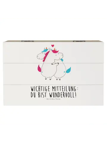 Die Holzkiste von Mr. & Mrs. Panda ist ein kleiner Schatz in jedem Zuhause! Sie ist die perfekte Größe, um all deine besonderen Momente festzuhalten. Ob Fotografien, kleine Erinnerungsstücke oder Bestimmungen für bestimmte Anlässe – diese Kiste aus robuster Holzfaser bietet viel Platz für deine Schätze. Mit liebevollen Motiven und Sprüchen verziert, bringt sie Freude und Farbe in jedes Zimmer. Ihr besonderes Design mit Einschlagscharniere ermöglicht ein müheloses Öffnen und Schließen. Diese Kisten sind nicht nur schön, sondern auch nachhaltig und perfekt als wiederverwendbare Geschenkbox für deine Liebsten. Sie ist nicht abschließbar, damit deine Erinnerungen immer sichtbar bleiben. Pflege sie mit einem feuchten Tuch, um ihre Schönheit zu bewahren! Es gibt diese Kiste auch in verschiedenen Größen.Einhorn: Lustige Liebesbotschaft für den Valentinstag!: Das Motiv zeigt zwei Einhörner in inniger Umarmung, die einander zeigen, wie sehr sie sich lieben. Der Spruch ‚Wichtige Mitteilung: du bist wundervoll!‘ sagt alles, was gesagt werden muss. Mit ihren funkelnden Augen und der verspielten Ausstrahlung erinnern uns diese Einhörner an die Freude, die die Liebe mit sich bringt. Ideal als Geschenk für den Valentinstag oder einfach als süße kleine Überraschung für deinen Partner. Diese Motive verleihen jedem Raum einen Hauch von Magie und vermitteln eine ermutigende Botschaft der Wertschätzung. Mr. und Mrs. Panda sind der Meinung, dass jeder Tag ein Grund zur Feier sein kann, besonders wenn es um die Liebe geht.Bunte Einhorn-Deko: Die Einhorn-Kollektion von Mr. & Mrs. Panda bringt einen Hauch von Feenstaub in dein Leben! Mit bunten, einladenden Designs, die die unbeschwerte Freude von Einhörnern widerspiegeln, ist diese Kollektion perfekt, um eine fröhliche Atmosphäre zu schaffen. Jedes Stück wurde von der talentierten Mrs. Panda entworfen und wird sicher die Herzen aller deiner Freunde gewinnen. Ob du nach einer ausgefallenen Deko für dein Zuhause suchst oder ein außergewöhnliches Geschenk für einen geliebten Menschen – die Einhorn-Kollektion hat alles! Lass die tollen Motive deine Wände zieren, deinen Tisch schmücken und dein Herz erfreuen. Kaffeetassen, T-Shirts oder Wandbilder – alles, was dein Einhorn-Herz begehrt, findest du hier. Bring das Lächeln und die Leichtigkeit, die mit Einhörnern assoziiert werden, in dein Leben.Unser Produkt wird gesucht als: Holzbox, Geschenk, Witzig, Partner, truhe mit deckel, Schatulle, Holzkiste mit Deckel, Geschenkbox, truhe holz, Kiste mit Deckel, Einhörner, Aufbewahrungsbox aus Holz, schmuckkiste, schmucktruhe, Valentinstag, Truhe, Box aus Holz, geschenkkiste, holzschachtel, Erinnerungskiste, geschenkbox holz, Aufbewahrungstruhe, Holztruhe, schmuckbox, holzkästchen, fotokiste, Erinnerungsbox, schatzkiste holz, kiste holz, Holzkiste, fotobox, holzschatulle, aufbewahrungskiste mit deckel, Einhorn, Aufbewahrungsbox Holz, Kiste, box holz, Box, erinnerungsbox holz, Liebe, Lustig, Unicorn, geschenkbox mit deckel, Spruch, Schatzkiste, Holzbox mit Deckel, Valentine, Ehe, Aufbewahrungskiste, schatztruhe, Holz Aufbewahrungsbox