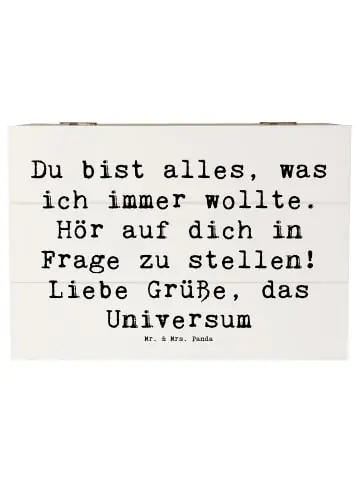 Erlebe die zauberhafte Holzkiste von Mr. & Mrs. Panda! Sie ist der ideale Ort für die Aufbewahrung deiner wertvollsten Erinnerungen. Ob Fotos, Kleinigkeiten oder ein besonderes Geschenk – diese Kiste aus robuster Holzfaser ist sowohl dekorativ als auch funktional. Ihre bezaubernden Motive und Sprüche verleihen jedem Raum einen Hauch von Freude. Außerdem ist sie eine hervorragende Wahl als nachhaltige und wiederverwendbare Geschenkbox, die nicht nur praktisch, sondern auch stilvoll ist. Die Einschlagscharniere sorgen dafür, dass das Öffnen und Schließen ganz mühelos geht. Beachte, dass sie nicht abschließbar ist. Pflegehinweis: Einfach mit einem feuchten Tuch abwischen, um ihre Schönheit zu erhalten.Unser Produkt wird gesucht als: Holzkiste mit Deckel, Erinnerungskiste, Holzkiste, erinnerungsbox holz, Stimmungen, Aufbewahrungsbox aus Holz, Herz, Geschenkbox, holzschachtel, Schatulle, Gefühl, Motivation, Mitgefühl, Emotionen, Mut, Gefühle, holzschatulle, Erinnerungsbox, Hoffnung, Holztruhe, holzkästchen, aufbewahrungskiste mit deckel, Freude, Box, Licht, Emotionale Produkte, fotokiste, box holz, Holzbox mit Deckel, Kiste mit Deckel, geschenkbox holz, Traurigkeit, Inspiration, Box aus Holz, schmuckbox, schmuckkiste, schatzkiste holz, Herzensgeschenke, Zitat, kiste holz, Truhe, Zuversicht, truhe holz, schatztruhe, Aufbewahrungstruhe, Geschenke, geschenkbox mit deckel, Spruch, Kiste, truhe mit deckel, Stimmungsvolle Designs, Stimmung, Holzbox, Holz Aufbewahrungsbox, fotobox, Ausdruck von Gefühlen, Vertrauen, schmucktruhe, Schatzkiste, Träume, Positivität, Aufbewahrungskiste, geschenkkiste, Liebe, Aufbewahrungsbox Holz