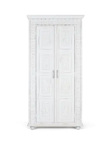Der Schrank ist aus Mangoholz gefertigt und seine weiße Antik-Lackierung verleiht ihm einen gealterten Stil. An der Ober- und Unterseite sind feine Zierleisten zu sehen, die dem Design zusätzliche Raffinesse verleihen. Im Mittelpunkt stehen die beiden Vordertüren, die durch goldmetallische Details gekennzeichnet sind, die einen luxuriösen Kontrast zur weißen Patina bilden. Im Inneren bietet der Kleiderschrank mit drei großen Regalen viel Stauraum, ideal für die übersichtliche Aufbewahrung aller Arten von Kleidung oder Accessoires. Den Sockel des Schrankes bilden vier gedrechselte Kugeln, die für Stabilität und eine rustikale Note sorgen. Wood
