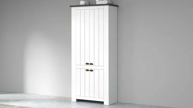 Made in Italy- Der Schuhschrank FIGO hat eine Breite von 84 cm, eine Tiefe von 42 cm und eine Höhe von 200 cm. Türen sind mit Metall-Muschelgriffen und Siebdruck sowie dekorativen Fräsungen versehen, die dem Schuhschrank einen charmanten Landhausstil verleihen. Mit insgesamt 10 Fächern bietet der Schuhschrank ausreichend Platz für die ordentliche und organisierte Aufbewahrung von ca. 40 Paar Schuhen. Eine benutzerfreundliche und clevere Möglichkeit, Schuhe im Eingangsbereich ordentlich zu verstauen. Belastbarkeit pro Boden max. 5 kg. Garderobenschrank aus stabilen FSC®-zertifiziertem Holzwerkstoff zum Schutz der Wälder