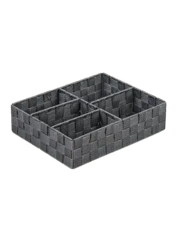 Wenn im Bad Chaos herrscht, schafft das Füllkörbchen Ordnung. Doch die Organizerbox ist nicht nur für das Badezimmer geeignet. Im ganzen Haus hält die Aufbewahrungskiste mit 5 Fächern die Dinge des Alltags übersichtlich an ihrem Platz. Die Ordnungsbox in geflochtener Optik ziert das Schlafzimmer als Sockenbox oder wird im Wohnzimmer zur Aufbewahrung von Kabeln oder Bastelmaterialien genutzt. Das Aufbewahrungskörbchen ist Ihr vielseitiger Ordnungshelfer im ganzen Haushalt.Aufbewahrungskorb im Detail – Größe H x B x T: ca. 8,5 x 32 x 25 cm – 2x Fach B x T: ca. 15 x 11,5 cm – 3x Fach B x T: ca. 15 x 7,5 cm – Gewicht: ca. 400 g – Material: Kunststoff (PP, Nylon), Metall – In verschiedenen Farben erhältlichOrganizer für Schrank und Regal – Praktische Ordnungsbox aus robustem Kunststoff – Für Bad, Wohn- & Schlafzimmer, Flur uvm. – Ideal zur Aufbewahrung kleiner Gegenstände – Unterteilt in 5 Fächer – Utensilien sortieren – Dekorative Aufbewahrung in geflochtener OptikLieferumfang – 1x Regalkorb in Farbe nach Wahl – Dekoartikel nicht im Lieferumfang enthalten