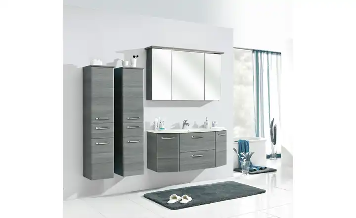 Die optimale Ergänzung zum Waschtisch Alba ist dieser Waschtischunterschrank mit gleichem Namen. Er passt mit seiner besonderen Formgebung genau zum Design des Waschtisches. Links und rechts ist jeweils eine Tür. Dahinter sind je zwei Fächer mit einem Boden dazwischen. Mittig hat der Schrank oben eine Klappe und direkt darunter ein Schubfach. Durch den Graphitton (Nachbildung) setzt sich Alba kontrastreich vom weißen Waschtisch ab.