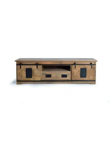 TV-Schrank mit 2 Schiebetüren und 1 Schublade aus Mangoholz, Details aus Metall. Artikelmaße: 55cm Höhe -180cm Länge – 50cm. Artikelgewicht: 54kg. Wood