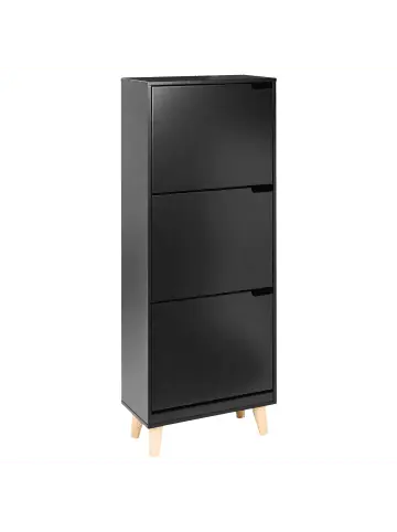 Hoher, moderner Schuhkipper mit 3 Klappen. Diese schlichte Schuhkommode ist mit 3 geräumigen Klappfächern ausgestattet, die für Ordnung und Übersicht in Ihrem Flur oder Ihrer Garderobe sorgen. Der gesamte Schuhkipper ist in einem stilvollen, klassischen Schwarzton gehalten und mit schlichten Fronten versehen, die perfekt zu der klaren Linienführung des Modells passen. Zudem besitzt der Schuhschrank sowohl eine robuste Konstruktion als auch standsichere Holzbeine. Dank seiner geschlossenen Fächer, pflegeleichten Oberflächen und seiner kompakten Form ist er die perfekte Wahl für jeden, der einen aufgeräumten Look schätzt.Details: Typ: Schuhschrank Farbe: Schwarz Farbton: Hellbraun Material: MDF-Platte Zusätzliches Material: Gummibaumholz Material Rand: Holzwerkstoff Gestellmaterial: Holz Tischplattenmaterial: Holzwerkstoff Finish: Gefärbt Schutzkappen / Filzgleiter: Nein Volumen: für 12 Paar SchuheDimensions: Tiefe: 24 cm Breite: 47 cm Höhe: 121 cm Gewicht: 18 kg Max. Belastung der Oberplatte: 60 kgSie kaufen: 1 x SchuhschrankProduktvorteile: Passt wunderbar zu jedem Einrichtungsstil, Modernes Design, Qualitativ hochwertiges Material, Stabile und solide Konstruktion, Praktischer, großer StauraumMontage: Nicht montiert. 20 – 40 Min.Zusatzinformationen: Bitte beachten: Aus Sicherheitsgründen muss das Produkt an der Wand montiert werden.Pflegeanleitung:MDF-Platte: 1.Bitte ausschließlich milde Reinigungsmittel und weiche Tücher verwenden. Feuchte Stellen sofort trocken reiben.Gummibaumholz: 1.Bitte ausschließlich milde Reinigungsmittel und weiche Tüchern verwenden. Dabei immer in Richtung der Maserung abwischen 2.Sofort nach der Reinigung abtrocknen, um zu verhindern, dass sich Wasser auf dem Produkt absetzt 3.Nur bei geölten Holzartikeln befolgen: Sie sollten nach einiger Zeit nachgeölt werden, damit sie lange in einem guten Zustand erhalten bleiben.