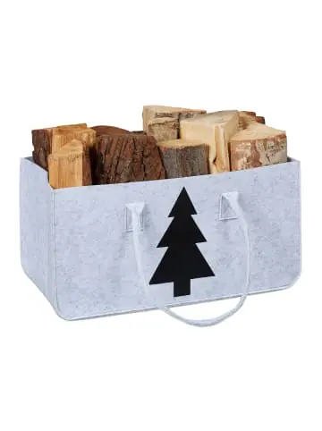 Mit diesem Brennholzkorb lagerst Du Kaminholz nicht nur zuverlässig sondern auch stilvoll. So fügt sich das moderne Design aus hellgrauem Filz ideal in Wohnzimmer und Co. ein und kann besonders mit dem winterlichen Tannenbaum-Motiv überzeugen. Die praktische Filztasche ist universell einsetzbar und bietet viel Platz für Brennholz, aber auch Zeitschriften, Spielzeug oder den Einkauf. Dank der handlichen Tragegriffe kann der Aufbewahrungskorb auch im gefüllten Zustand leicht transportiert werden.Filzkorb im Detail – Maße H x B x T: ca. 25 x 50 x 25 cm – Fassungsvermögen: ca. 28 l – Traglast: bis 12 kg – Gewicht: ca. 300 g – Material: Filz – Farbe: Hellgrau, SchwarzPraktische Feuerholztasche – Robuste Tasche aus langlebigem Filz in Hellgrau – Winterliches Design mit schwarzem Tannenbaum-Motiv – Filztasche ist ideal für die Lagerung von Kaminholz – Auch als Aufbewahrung- oder Einkaufskorb verwendbar – Bei Nichtgebrauch platzsparend zusammenfalten und verstauen – Leicht zu transportieren dank der stabilen TragegriffeLieferumfang – 1x Filztasche – Dekoartikel sind nicht im Lieferumfang enthalten