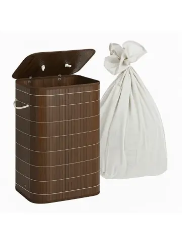 Mit dem Wäschesammler holst Du Dir einen praktischen Ordnungshelfer nach Hause. Die große Wäschebox bietet Platz für viel Schmutzwäche, die dank des klappbaren Deckels diskret bis zum nächsten Waschgang verstaut ist. An den Griffen lässt sich der Kleiderkorb bequem zur Waschmaschine transportieren. Bei Bedarf kannst Du den Wäschesammelkorb platzsparend zusammenfalten und verstauen. Für die nötige Hygiene sorgt der entnehmbare, waschbare Wäschesack.Wäschekorb im Detail – Maße H x B x T: ca. 60 x 40 x 30 cm – Volumen: ca. 80 l – Traglast: ca. 10 kg – Material: Bambus, Polyester, Baumwolle, Viskose, Eisen, MDF – In verschiedenen Farben erhältlichFaltbarer Wäschebehälter mit Deckel – Zum ordentlichen Zusammentragen Deiner Wäsche – Mit Deckel – Inhalt der Wäschetruhe bleibt verborgen – Entnehmbarer Wäschesack ist bei 30 °C waschbar – An Tragegriffen bequem zur Waschmaschine transportieren – Bei Bedarf zusammenfalten und platzsparend verstauen – MDF-Boden und Metallring sorgen für sicheren Stand – Praktische Wäschetonne für Bad und SchlafzimmerLieferumfang – 1x Schmutzwäschekorb in Einzelteilen – Anleitung – Dekoartikel sind nicht im Lieferumfang enthalten
