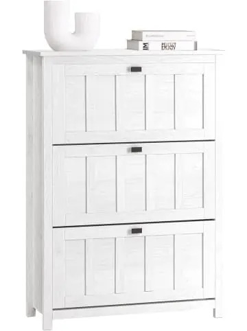 Mit den 3 Klappfächern können Sie ganz frei Schuhen in verschiedenen Größen und Formen aufbewahren. Die Höhe der Schuhfächer können durch herausnehmbare Böden verstellt werden, somit haben auch höhere Schuhe hier Platz. Die obere Platte kann auch als Ablagefläche genutzt werden. Stellen Sie Blumen oder einen Bilderrahmen auf und Schaffen Sie so Ihr wohlfühlambiente.Gewicht: ca. 24,9kg; Belastbarkeit: bis 26kg(Obere Platte 17 kg, jede Klappe 3 kg); Material: PB(E1), MDF(E1).