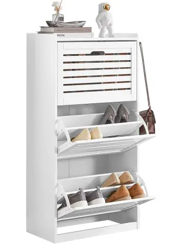 Mit diesem Schuhkipper sagen Sie dem Schuhchaos in Ihrem Flur den Kampf an! Der geschlossene Schuhschrank schützt Ihre Sandalen, High Heels und Turnschuhe gegen Staub, Ausbleichen und sorgen für einen ordentlichen Flur. Durch 3 Kippfächer mit 6 Ablageflächen im Inneren, können Sie Ihre Schuhe ordentlich verstauen. Die Höhe der Schuhfächer können durch herausnehmbare Böden verstellt werden, somit haben auch höhere Schuhe hier Platz. Kleine Highlights! Mit den zwei schönen Haken bietet dieser Schuhschrank ausreichend Platz für Ihrer Jacken, leichte Tasche, Schals uvm.Gewicht: ca.19,8kg; Belastbarkeit: bis 45kg; Material: MDF(E1), PB(E1).
