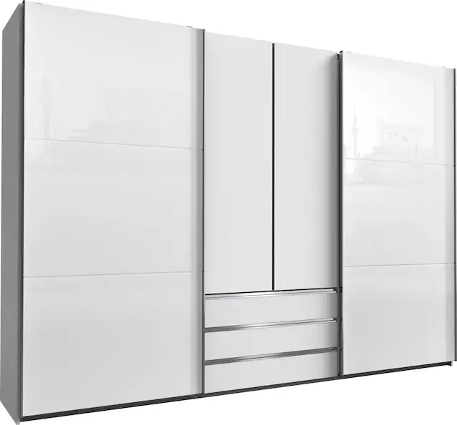 Schwebetüren außen mit Glas-Elementen. Mittig mit 2 Drehtüren. Mit geräumigen Schubkästen. Sockelhöhenverstellung zum Ausgleich von Fußbodenunebenheiten. Tiefe/Höhe: 65/216 cm bzw. 236 cm