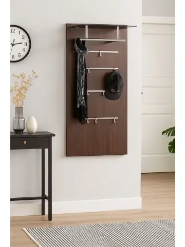 Modernes Wandgarderobenpaneel mit einem Glasboden aus Sicherheits-Schwarzglas, darunter chromfarbene Kleiderstange aus Stahlrohr. Auf dem Paneel sind insgesamt 4 chromfarbene Metallleisten aufgesetzt, mit insgesamt 8 Kleiderhaken, die individuell angebracht werden können. Paneele ist aus MDF, braun beschichtet. Ohne Dekoration. Im Lieferumfang ist die Paneele wie beschrieben. Gesamtmaße ca. cm: B. 60 x H. 120 x T. 26- Mit vielen Ablagefunktionen- Optische, edle Oberflächen- Sicherheitsglasablage