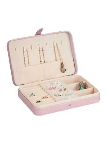 Mit diesem Schmuck-Organizer bewahrst Du Deine liebsten Schmuckstücke geordnet und übersichtlich auf, sowohl zu Hause, als auch auf Deiner nächsten Reise. Dank der kompakten Größe kann die Schmucktasche überall hin mitgenommen werden, während gleichzeitig ausreichend Platz für Ringe, Ketten, Ohrstecker und mehr geboten wird. Auch auf der Kommode überzeugt die Schmuckaufbewahrung durch schlichtes Design und Lederoptik. Der weiche Bezug schützt Deine Schmuckstücke dabei zuverlässig vor Kratzern.Reise-Schmucketui im Detail – Maße H x B x T: ca. 4,5 x 21 x 14,5 cm / ca. 260 g – Frei einteilbares Fach mit 2 Trennern H x B x T: ca. 2 x 6,5 x 13 cm – Fach unter Ohrsteckerhalter H x B x T: ca. 2 x 5,5 x 12 cm – Ohrsteckerhalter für bis zu 18 Paar Ohrringe – Breite 8 Ringfächer: ca. 6,5 cm – Deckel mit 7 Schmuckhaken und Tasche – Material: Kunststoff, Samt, MDF – In verschiedenen FarbenKleine Schmuckaufbewahrung mit viel Stauraum – Größe eignet sich ideal zum Mitnehmen auf Reisen – Haken im Deckel für Armbänder, Ketten uvm. – Ohrsteckerhalterung für bis zu 18 Paar Ohrringe – Großes Fach über 2 Trenner frei einteilbar – Schmuckbox bietet extra Platz für Ringe – Samtbezug schützt Schmuckstücke vor KratzernLieferumfang – 1x Schmucktasche – Dekoartikel sind nicht im Lieferumfang enthalten