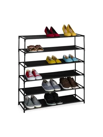Mit diesem platzsparenden Schuhregal gehören herumliegende Schuhe der Vergangenheit an. Die Schuhablage ist ideal für den Flur, das Schlaf- oder Ankleidezimmer. Pro Ebene können dabei 3 Paar Schuhe verstaut werden. So hast Du mit dem Schuhständer Dein liebstes Schuhwerk passend zum Outfit oder Wetter jederzeit griffbereit. Der praktische Schuhgestell mit Stecksystem ist schnell aufgebaut. Das schlichte Design aus Metallgestell und Stoffablagen fügt sich vielseitig ein. Schuhregal im Detail – Ablagefläche B x T: ca. 75 x 28 cm – Abstand der Ablagen: ca. 16 cm – Traglast je Ablage: max. 3 kg – Materialien: Stahl, Vlies, PP – Farbe: SchwarzSchuhgestell in verschiedenen Größen – Maße 4 Ebenen H x B x T: ca. 55 x 83 x 28 cm / ca. 0,9 kg – Maße 6 Ebenen H x B x T: ca. 90 x 83 x 28 cm / ca. 1,4 kg – Maße 8 Ebenen H x B x T: ca. 124 x 83 x 28 cm / ca. 1,8 kg – Maße 10 Ebenen H x B x T: ca. 158 x 83 x 28 cm / ca. 2,3 kgSchuhständer für den Flur – Zur Aufbewahrung von 3 Paar Schuhen pro Ebene – Platzsparende Schuhablage durch schmales Design – Offenes Schuhgestell für schnellen Zugriff – Schwarzes Metallgestell mit Ablagen aus Stoff – Schneller, unkomplizierter Aufbau mit Stecksystem – Mit Wandmontagematerial für mehr StabilitätLieferumfang – 1x Schuhorganizer in Einzelteilen – Mit Anleitung – Mit Montagematerial – Dekoartikel sind nicht im Lieferumfang enthalten