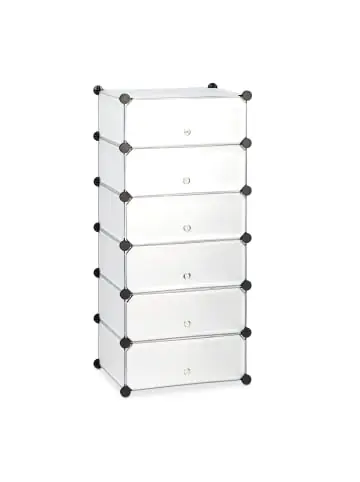 Wer viele Schuhe hat, kann schnell mal Platzprobleme bekommen. Ein kleiner Flur bietet oft nicht genug Raum, um ein großes Schuhregal oder einen -schrank aufzustellen. Der Schuhschrank mit 6 Ebenen bietet die perfekte Lösung: Das Steckregal nutzt den Stauraum in der Höhe und nimmt dabei nur eine geringe Grundfläche ein. Es bietet Platz für mindestens 12 Paar Schuhe, bei Kinderschuhen oder Ballerinas sogar noch mehr. Der Schuhschrank ist in drei verschiedenen Farbvarianten erhältlich: Wählen Sie zwischen der schlichten weißen Variante, der schwarzen Ausführung mit dekorativer Verzierung und transparenten Türen und dem durchsichtigen Schuhständer, bei dem Sie auch bei geschlossenen Türen immer den Überblick über Ihre Schuhe behalten.Schuhregal mit 6 Ebenen im Detail – Maße H x B x T: ca. 107 x 49 x 37 cm – Maße je Fach H x B x T: ca. 17 x 45 x 35 cm – Gewicht: ca. 4,8 kg – Maximale Traglast: ca. 5 kg pro Fach – Material: Kunststoff, Metall – Farben: In Schwarz, Weiß und Transparent erhältlichEnthaltene Teile des Regalsystems – 12 Wände je ca. 17 x 35 cm – 6 Wände je ca. 17 x 45 cm – 7 Wände je ca. 35 x 45 cm – 6 Türen je ca. 17 x 45 cm – 30 VerbindungsstückePlatzsparendes Schuhregal zum Zusammenstecken – 6 Ebenen bieten Platz für mindestens 12 Paar Schuhe – Als offenes Regal oder geschlossener Schrank nutzbar – Einfacher Aufbau ohne Bohren und Schrauben dank Stecksystem – Nimmt nur geringe Grundfläche ein, Stauraum wird in der Höhe genutzt – Kann in verschiedenen Varianten zusammengebaut werdenLieferumfang – Schuhregal in Einzelteilen – Beispielhafte Aufbauanleitung – Holzhammer – Dekorationsartikel sind nicht im Lieferumfang enthalten