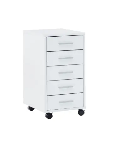 Artikelnummer: SuVa11684_1 EAN: 4250950281295Design• Rollcontainer im modernen und zeitlosen Design • Fünf geräumige Schubladen mit silbernem Griff • Unkompliziertes Design mit klaren Formen • Praktische Rollen an der Unterseite des ContainersAbmessungen• Gesamtmaß (BxHxT): 33 x 63 x 38 cm • Innenmaß der Schübe (BxHxT): 25 x 7 x 29 cm • Ablagefläche (BxT): 33 x 38 cm • Maximale Belastbarkeit je Schublade: 5 kgBesonderheiten• Individuell einsetzbar – sowohl neben als auch unter dem Schreibtisch • Rollen mit Bremsen sorgen für sicheren Stand, sobald der Container platziert wurde • Mit Melaminharz beschichtete Oberflächen zum Schutz vor Kratzern & FlüssigkeitMaterial• Rollcontainer: Spanplatte, Melaminharz beschichtet • Rollen und Griffe: KunststoffLieferumfang• Ein Rollcontainer ohne Dekoration • Leicht verständliche Montageanleitung inklusiveMontage• Lieferzustand: Zerlegt und praktisch verpackt • Einfacher und schneller Aufbau dank gut durchdachter KonstruktionInformation zur MelaminharzbeschichtungDas Kunstharz Melamin ist aufgrund seiner Eigenschaften ein idealer Werkstoff, um Möbel zu beschichten. Es bildet äußerst harte und kratzfeste Oberflächen und ist dabei wasserabweisend und fettfest.PflegehinweisMit feuchtem Tuch, evtl. mit mildem Reinigungsmittel abwischen, mit trockenem Tuch nachwischen keine scharfen oder lösungsmittelhaltigen Reiniger verwenden