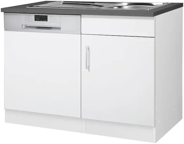 Hochwertiger Küchenspülenschrank aus Holzwerkstoff. Bietet viel praktischen Stauraum. Alle Beschläge sind aus Metall. Inklusive Einbauspüle. Mit Möbelfront für teilintegrierten Geschirrspüler