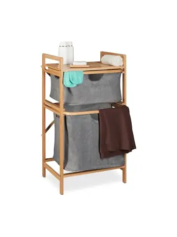 Verstaue Deine Schmutzwäsche ordentlich bis zum nächsten Waschgang. Die ausziehbaren Wäschekörbe bieten ausreichend Platz, um Deine Schmutzwäsche diskret aufzubewahren. Gleichzeitig wird mit der oberen Ablagefläche zusätzlicher Stauraum für Handtücher, Waschmittel und Badutensilien geboten. Das moderne Design und der Materialmix aus Bambus und grauem Stoff machen die praktische Kombination aus Wäschesortierer und Badregal zum Hingucker in Deinem Schlaf- oder Badezimmer.Wäschekorb Regal im Detail – Gesamtmaße H x B x T: ca. 85 x 44 x 33 cm – Volumen Wäschekörbe: ca. 27 / 47 L – Gewicht: ca. 3,3 kg – Material: Bambus, Polyester, Baumwolle – Farbe: Natur, GrauBadregal mit Wäschesammler – Box oben H x B x T: ca. 21 x 40,5 x 32,5 cm – Box unten H x B x T: ca. 36,5 x 40,5 x 32,5 cm – Traglast der Ablage: ca. 2,5 kg – Traglast Korb oben: ca. 5 kg – Traglast Korb unten: ca. 10 kgPraktischer Wäscheschrank mit 2 Körben – Platzsparende Kombi aus Regal und Wäscheaufbewahrung – Diskrete Schmutzwäscheaufbewahrung in Bade- oder Schlafzimmer – Mit 2 herausziehbaren Wäschekörben aus grauem Stoff – Obere Ablagefläche bietet Platz für Deko und Badaccessoires – Bambus mit natürlicher Maserung eignet sich ideal für FeuchträumeLieferumfang – 1x Wäschekorbregal in Einzelteilen – Inklusive Anleitung und Montagematerial – Dekoartikel sind nicht im Lieferumfang enthalten