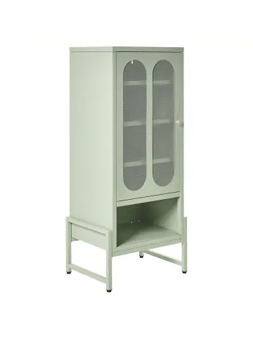 Mintgrüner Metallschrank mit perforierter Tür. Dieser halbhohe Mehrzweckschrank ist aus kaltgewalztem Stahl zusammengeschweißt und mit einer perforierten Türfront ergänzt, die für die notwendige Belüftung sorgt. Dank der robusten Konstruktion und der Farbbeschichtung ist er vor Korrosion entsprechend geschützt und daher auch langanhaltend schön. Die offene Regalfläche hält alles griffbereit geordnet, während die verstellbaren Ablageböden im Schrankinneren Platz für alle Ihre Dokumente oder andere Sachen liefern. Zur Kippsicherung lässt sich der Metallschrank an der Wand befestigen.Details: Typ: Büroschränke Stil: Industriell Farbe: Grün Farbton: Mintgrün Material: Stahl Gestellmaterial: Metall Anzahl Einlegeböden: 5 Türöffnungsarten: Standard Schubladen: Nein Finish: Gefärbt Abschliessbar: Nein Türanzahl: 1 Regalböden: JaDimensions: Tiefe: 35 cm Breite: 47 cm Höhe: 108 cm Gewicht: 14 kg Max. Belastung pro Fach: 30 kg Max. Belastung der Oberplatte: 30 kgSie kaufen: 1 x SideboardProduktvorteile: Leicht zugängliches, offenes Regal, Stabile und solide Konstruktion, Perfekt geeignet für alle Wohn- und Arbeitsbereiche, Praktischer, großer Stauraum, Schutzkappen zum Schutz des Bodens, Lüftungsschlitze für konstanten LuftaustauschMontage: Nicht montiert. 20 – 40 Min.Zusatzinformationen: Bitte beachten: Aus Sicherheitsgründen muss das Produkt an der Wand montiert werden.Pflegeanleitung:Stahl: 1.Bitte ausschließlich handelsübliche, milde Reinigungsmittel und weiche Tücher verwenden, wobei feuchte Stellen sofort trocken gerieben werden sollten 2.Vermeiden Sie scheuernde Reiniger, da diese die Oberfläche beschädigen können 3.Bei Chrom und Kupfer regelmäßig mit speziellen Pflegemitteln polieren.