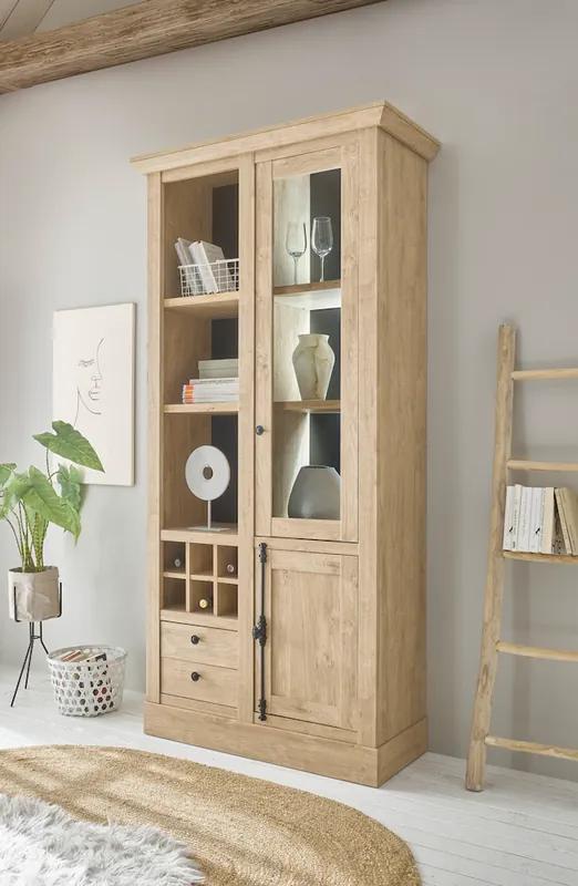Die Vitrine ist in zwei Größen erhältlich und aus FSC®-zertifizierten Holzwerkstoff gefertigt.. Der gemütliche Landhausstil und das warme Eiche Dekor sorgen für ein besonderes Wohnerlebniss.. Artikelmaße (aufgebaut): 105/ 42/ 214 cm (B/ T/ H).. Die Glasrahmentür, die offenen und geschlossenen Fächer sowie Schubkästen bieten ausreichend Platz für ihre Lieblingsstücke. Die Flascheneinteilung ergänzt das Möbelstück perfekt.. Die hochwertigen, verschnörkelten Metallgriffe sorgen an der Vitrine für einen echten Hingucker.