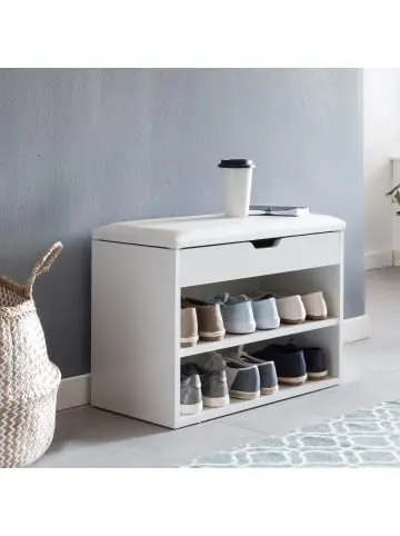 DesignModerne Garderobenbank mit klarer FormgebungSitzfläche der Klappe mit weißem KunstlederbezugZwei Ebenen zur Unterbringung der SchuheAbmessungenBreite: 60 cmHöhe: 40 cmTiefe: 30 cmInnenmaß Regalfächer: 57 x 22 x 28 cmInnenmaß Stauraumfach: 57 x 7 x 26 cmBeim Aufklappen der Box steht das Polster etwa 1 cm überFarbeKorpus: WeißBezug: Weißes KunstlederBesonderheitExtra viel Stauraum durch den Regalboden und das Fach unter der SitzflächeDurch eine Mulde lässt sich die Sitzfläche einfach aufstellenKomfortable Sitzfläche durch üppig gepolsterte AuflageBelastbarkeit der Garderobenbank liegt bei ca. 80 kgMaterialKorpus und Regalböden: Melaminharzbeschichtete SpanplatteSitzflächenbezug: KunstlederTextilzusammensetzungSitzbezug: 100% PolyurethanLieferumfangEine Garderobenbank ohne DekorationMontagematerial und Aufbauanleitung inklusiveMontageLieferzustand: Zerlegt und praktisch verpacktEinfacher und schneller Aufbau dank gut durchdachter KonstruktionPflegehinweisMit feuchtem Tuch abwischen, mit trockenem Tuch nachwischen. Bei Bedarf mildes Reinigungsmittel benutzen. Keine scharfen oder lösungsmittelhaltigen Reiniger verwenden.