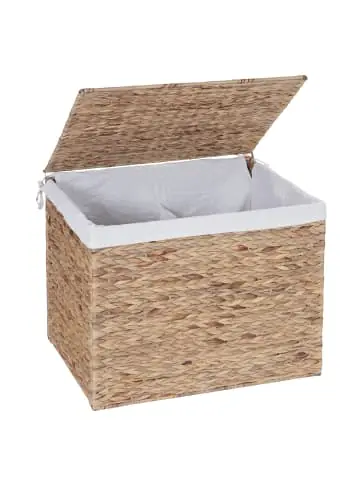 – Markeninhaber TÜV-Süd QM zertifiziert mit Nr. 12 100 59626 TMS für Qualitäts-Management in Deutschland – Lieferumfang: 1x Wäschekorb – Material Korb: Wasserhyazinthe – Material Stoffeinsatz: 50% Polyester, 50% Baumwolle – Platzsparend zusammenfaltbar – Stoffeinsatz ist herausnehmbar – Volumen 129l – Deckel ist nicht arretierbarMaße (ca.):Höhe: 50 cmBreite: 60 cmTiefe: 43 cm Dieser Wäschekorb aus Wasserhyazinthe, einem nachwachsenden, ökologischen Rohstoff, ist ein individuelles Meisterwerk der besten Designerin weltweit – Mutter Natur. Oft kopiert, doch nie erreicht – kein künstliches Material wird jemals die natürliche Schönheit eines Produktes aus organischem Material erreichen können. Praktisch und dekorativ – unser Wäschekorb vereint spielerisch beide Eigenschaften. Nun können Sie ganz einfach Ihre Wäsche trennen. Mithilfe der zwei geräumigen Aufteilungen kann die Wäsche vorsortiert werden, so dass beim Waschen wertvolle Zeit gespart wird. Der Textilbezug kann hinten mittels Bändern befestigt werden, vorne sind keine Befestigungsbänder vorhanden. Falls dadurch der Einsatz verrutschen sollte, können Sie entweder mit Klettstreifen oder zusätzlichen Bändern Abhilfe schaffen.Versandzustand: Teilmontiert–Sicherheitshinweise für Teilartikel mit Artikelnummer 61213 Dieser Artikel ist eine Wäschtruhe / ein Wäschekorb und sollte nur als solcher verwendet werden. Der Artikel ist nur für den Innenbereich geeignet. Überladen Sie den Artikel nicht. Vorsicht: Verletzungsgefahr! Setzen, stellen oder stützen Sie sich nicht auf den Artikel. Vorsicht: Kippgefahr & Verletzungsgefahr! Sorgen Sie immer für einen festen Stand des Artikels.Vorsicht Erstickungsgefahr! Verpackungsmaterial, wie Plastikbeutel, gehören nicht in Kinderhände. Bitte von Babys und Kleinkindern fernhalten! Nicht über den Kopf ziehen! Vorsicht: Verschluckungsgefahr! Achtung dieser Artikel kann verschluckbare Kleinteile enthalten! Halten Sie die Kleinteile von Kindern fern! Prüfen Sie den Artikel regelmäßig alle 3-6 Monate auf Beschädigungen und gelöste Verbindungen. Ziehen Sie lose Schrauben wieder fest an! Sollten Beschädigungen entdeckt werden, darf der Artikel nicht mehr genutzt werden! Benutzen Sie diesen Artikel nur für die bestimmungsgemäße Verwendung, im technisch einwandfreien Zustand und für private Zwecke. Andere Verwendungen gelten als nicht bestimmungsgemäß und können zu schweren Verletzungen und Beschädigungen führen. Für aus bestimmungswidriger Verwendung entstandene Schäden übernimmt der Hersteller keine Haftung.Allgemeine Hinweise: Bitte lesen Sie alle Hinweise sorgfältig durch, bevor Sie den Artikel aufbauen und verwenden. Verwahren Sie die alle Sicherheitsinformationen und Aufbauanleitungen gut auf. Für Ihre eigene Sicherheit und die Ihres Produktes, befolgen Sie bitte die Sicherheitshinweise. Eine falsche Handhabung könnte zu ernsten Verletzungen, beschädigtem Eigentum oder sogar dem Tod hinauslaufen.Pflegehinweise: Saugen Polstermöbel regelmäßig ab. Hat der Artikel einen Bezug pflegen und reinigen Sie diesen entsprechend nach Material (Textil, Leder, Kunstleder). Besteht ihr Möbel aus Holz nutzen Sie einen Staubwedel zur Reinigung. Für alle anderen Oberflächen und bei stärkerem Schmutz können Sie ein nebelfeuchtes Baumwolltuch verwenden. Keinesfalls sollten Sie scharfe oder scheuernde Reiniger verwenden, diese können Schäden verursachen. Für Möbel im Bad: Wasser und Kondenswasser sofort abwischen! Entsorgungshinweise: Entsorgen Sie den Artikel umweltgerecht. Überlegen Sie Alternativen zu Entsorgung wie Spenden oder Verkaufen. Elektrische Artikel gehören nicht in den Hausmüll. Entsorgen Sie diese an einem Recyclinghof für elektrische und elektronische Altgeräte, weitere Informationen erhalten Sie bei Ihrer örtlichen Gemeindeverwaltung. Einlagerungshinweise: Der Artikel sollte trocken und sauber sein, verwahren Sie diesen geschützt in d