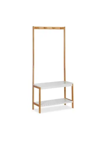 Bringen Sie Ordnung in Ihr Jacken-Chaos. Mit dieser schicken Standgarderobe sorgen Sie für Stauraum in der Diele. An den 4 Haken haben Sie ausreichend Platz zum Aufhängen von Jacken, Mäntel oder Mützen. Nutzen Sie die Ablagefläche zum Abstellen Ihrer Handtasche oder zur Aufbewahrung von Schals und anderen Accessoires. Auf der untersten Ebene haben Sie Ihre Schuhe immer griffbereit.Die freistehende Kleiderablage kann beliebig im Raum platziert werden und kommt ohne lästiges Bohren aus. Durch die natürliche und helle Optik fügt sich die Kleiderstange in jede Wohnungseinrichtung ein.Garderobenständer im Detail – Gesamtgröße H x B x T: ca. 150 x 70,5 x 30 cm – Gewicht: ca. 7 kg – Traglast Hakenleiste: ca. 20 kg – Traglast pro Ablage: ca. 15 kg – Material: Bambus, MDF – Farbe: Natur, WeißKleiderbutler mit viel Stauraum – Ablagefläche B x T: ca. 70 x 30 cm – Schuhablage B x T: ca. 67 x 30 cm – Abstand zwischen den Ebenen: ca. 26,5 cm – Abstand Ablage und Hakenleiste: ca. 99 cmDekorative Garderobe für Flur, Diele und Büro – Sorgt für Ordnung in Ihrem Zuhause – Freistehendes Design ohne Bohren – Stabile Flurgarderobe aus Bambus und MDF – Platz für Mäntel, Jacken und Gästejacken – Mit praktischem integrierten SchuhregalLieferumfang – 1 x Garderobenständer in Einzelteilen – 1 x Montagematerial – 1 x Anleitung – Dekoartikel sind nicht im Lieferumfang enthalten