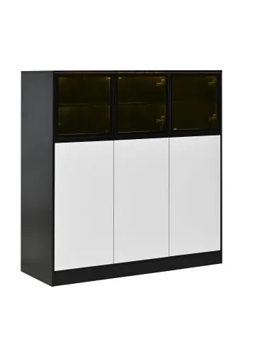 Klares Design & intelligente Beleuchtung:Moderne Zweifarben-Gestaltung in Schwarz und Weiß passt zu vielen Einrichtungsstilen.Integrierte RGB-LED-Beleuchtung mit 24 einstellbaren Farben für individuelle Akzente.3 transparente Glastüren oben für die Präsentation von Dekoration, Glaswaren oder Sammlerstücken.3 weiße Volltüren unten für diskrete Aufbewahrung.Optimierter Stauraum & Stabilität:Insgesamt 14 Fächer für übersichtliche Organisation – ideal für Geschirr, Vorräte, Bücher oder Technik.Stabile Konstruktion aus hochwertigen Spanplatten mit robuster Verarbeitung.Integrierter Kippschutz für sicheren Stand.Hohe Tragkraft: Arbeitsplatte bis 50 kg, Schubladen bis 20 kg.Praktische Details:Maße: 100 (B) x 40 (T) x 105 (H) cm – schlank und platzsparend, aber mit großem Fassungsvermögen.Einfache Montage mit klarer Anleitung.Lieferung in 2 Paketen.Ideal als Aufbewahrungslösung für Wohnzimmer, Küche, Esszimmer oder Flur – ein funktionales Möbelstück, das durch Lichtakzente und klares Design besticht.