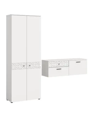Prisma Garderobenmöbel Set Weiß. Bringen Sie Ordnung und Eleganz in Ihre Räume mit dieser modernen und zeitlosen Garderobenkombination. Ideal für Flur, Diele oder auch Hauswirtschaftsräume, verbindet dieses Möbelstück Funktionalität mit edlem Design. Produktdetails im Überblick: Großzügige Maße: Die Abmessungen von 195x192x34 cm bieten ausreichend Platz für Ihre Garderobe und Accessoires. Elegantes Design: Die Kombination aus weißer Nachbildung und Hochglanz-Absetzungen schafft eine stilvolle Atmosphäre. Praktisch und durchdacht: Die hochwertige Rillenoptik und die 2-teilige Konstruktion sorgen für ein harmonisches Erscheinungsbild und maximale Funktionalität. Robust und pflegeleicht: Gefertigt aus hochwertigen Materialien, bietet die Garderobenkombination Langlebigkeit und ist einfach zu reinigen. Umweltbewusst: Das Möbel besteht aus FSC®-zertifiziertem Holzwerkstoff und trägt aktiv zum Schutz der Wälder bei. Ob als Highlight in Ihrem Eingangsbereich oder als funktionales Möbelstück für den Hauswirtschaftsraum diese Garderobenkombination passt perfekt zu jedem modernen Wohnstil.