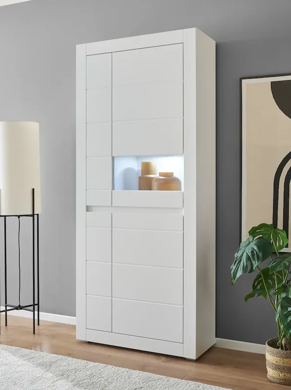 Die Stauraumvitrine ist aus FSC®-zertifizierten Holzwerkstoff gefertigt und enthält eine austauschbare Blende in der Farbe Weiß Matt oder Evoke Eiche.. Die geschlossenen Fächer bieten ausreichend Platz für private Gegenstände. Die Glastür setzt ihre Lieblingsstücke wunderbar in Szene.. Das moderne, zeitlose Design sorgt ein besonderes Wohnerlebnis und jedes Möbelstück trägt mit dem gewissen Extra dazu bei.. Die austauschbare Blende in der Griffleiste sorgt für eine echte Abwechslung und passt sich ideal Ihren Wohnideen an.. Artikelmaße (aufgebaut):85/ 35/ 198 cm (B/ T/ H).