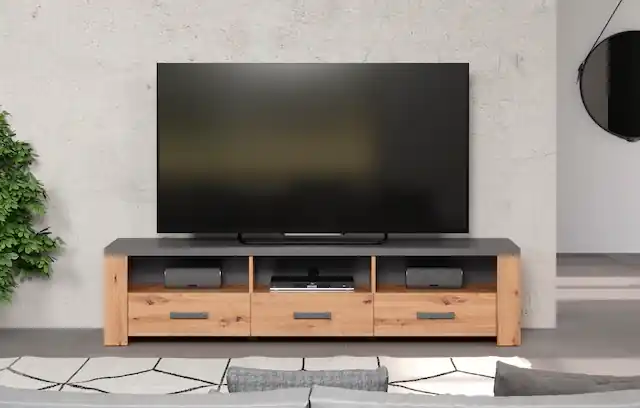 TV-Lowboard, Maße 180 cm Breite, 50 cm Tiefe, 43 cm Höhe. Ideal für große Fernseher, bietet in 3 offenen Fächern Platz für Geräte. Dieses sehr großzügige TV-Lowboard ist eine durchdachte Aufbewahrungslösung, die sich mit ihren Schubladen und Fächern perfekt in Deinen Alltag integrieren lässt. Gefertigt aus einem soliden Holzwerkstoff mit einer besonders kratzfesten Melaminbeschichtung, verspricht Dein Möbelstück eine lange Haltbarkeit und einfache Pflege. Drei offene Fächer ermöglichen eine optimale Luftzirkulation für Deine Mediengeräte, während die Schubladen dank Vollauszug einen leichten Zugriff garantieren. Die unempfindliche Oberfläche ist sehr leicht zu reinigen und zu pflegen, während die durchdachte Konstruktion eine problemlose Selbstmontage ermöglicht