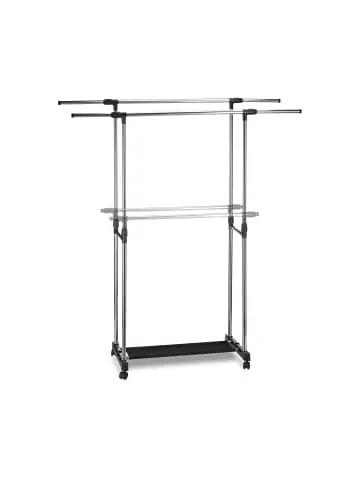 Mit der Rollgarderobe schaffen Sie Ordnung in Bad, Flur oder Schlafzimmer. Der Kleiderständer bietet Ihnen mit seinen 2 ausziehbaren Stangen viel Platz zum Aufhängen von Jacken, Mänteln und Kleidern. Auch die optimale Hängehöhe lässt sich mithilfe der Drehgelenke festlegen. Die Flurgarderobe ist dank ihrer 4 vollständig drehbaren Rollen mobil. Diese Eigenschaft hilft Ihnen, Kleidung oder Wäsche schnell und stressfrei von Raum zu Raum zu transportieren. Die Garderobe verfügt über eine Ablage aus schwarzem Vliesstoff, auf der 3 Paar Schuhe Platz finden. Rollgarderobe mit 2 Kleiderstangen im Detail – Maße minimal H x B x T: ca. 94 x 92 x 48 cm – Maße maximal H x B x T: ca. 162 x 150 x 48 cm – Fläche Schuhablage B x T: ca. 66 x 17,5 cm – Materialien: Edelstahl, PP, Vliesstoff – Gewicht: ca. 2,1 kgFahrbarer Kleiderständer – Für Bad, Flur oder Schlafzimmer – Mobil dank 360 Grad drehbarer Rollen – Schwarze Ablage für 3 Paar Schuhe – Stangen zum Ausziehen und FestdrehenLieferumfang – 1x Rollgarderobe in Einzelteilen – Mit Anleitung – Dekoartikel sind im Lieferumfang nicht enthalten