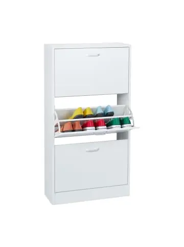 Mit diesem Schuhregal bringst Du Übersicht in Deine Schuhsammlung und sorgst für einen aufgeräumten Eingangsbereich. Durch seine kompakte Größe findet der Schuhständer auch im engsten Flur einen Platz und bietet auf geringer Stellfläche viel Stauraum. Jede Klappe verfügt über einen variabel einsatzbaren Einlegeboden, sodass Du sowohl Sneaker und Sandalen als auch Pumps und Stiefeletten verstauen kannst. Das schlichte Design in Weiß fügt sich hervorragend in moderne Einrichtungen ein.Schuhschrank im Detail – Maße 2 Klappen H x B x T: ca. 79 x 60 x 24 cm, ca. 14 kg – Maße 3 Klappen H x B x T: ca. 113 x 60 x 24 cm, ca. 19,3 kg – Traglast obere Ablage: max. 10 kg – Traglast je Fach: max. 5 kg – Material: Spanplatte, Aluminium, Kunststoff – Farbe: WeißFlexible Schuhablage – Maße Fach ohne Einlegeboden H x B x T: ca. 17,5 x 52 x 31,5 cm – Maße Einlegeboden B x T: ca. 55 x 14 cm – Fächerhöhe mit Einlegeboden: ca. 8,5 / 10 cm und 11 / 8,5 cmSchmaler Schuhkipper für den Flur – Ordentliche und übersichtliche Schuhufbewahrung – Auf geringer Stellfläche viele Schuhpaare verstauen – Variable Einlegeböden für verschiedene Schuharten – Ideales Schuhregal für Flur, Diele und Ankleidezimmer – Schlichtes Design in Weiß für moderne Einrichtungen – Möglichkeit zur Wandbefestigung für mehr StabilitätLieferumfang – 1x Schuhschrank – Wandbefestigungsmaterial – Mit Anleitung – Dekoartikel sind nicht im Lieferumfang enthalten