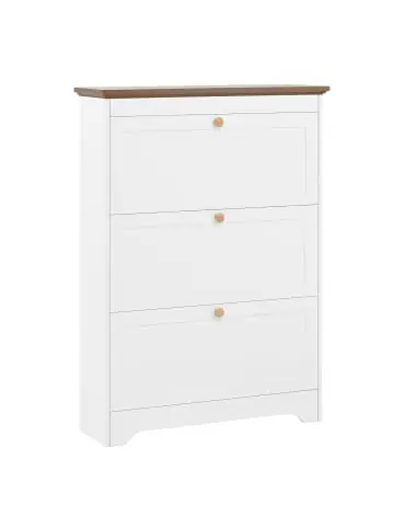 Charmantes Design & edle Details:Weißer Korpus kombiniert mit brauner Arbeitsplatte und runden Massivholzgriffen für einen warmen, französischen Landhausstil.Verlängerte Ablagefläche bietet Platz für Taschen, Schlüssel oder Deko – vereint Stauraum und Präsentation.Sanft abgerundete Optik für eine einladende Atmosphäre.Praktischer & leiser Stauraum:Drei geräumige Klappen mit Soft-Close-Mechanismus für sanftes, lautloses und sicheres Schließen.Jeweils zwei Einlegeböden pro Klappe für mehrere Paar Schuhe – ideal für die ganze Familie.Hohe Tragkraft der stabilen Konstruktion.Platzsparend & robust:Schmale, vertikale Bauweise – passt perfekt in Ecken oder schmale Flure, ohne Durchgänge zu blockieren.Stabile MDF-Konstruktion mit hochwertiger Verarbeitung.Einfache Montage mit beiliegender Anleitung und Werkzeug.Perfekt für:Eingangsbereiche im französischen, skandinavischen oder Landhausstil.Kleine Flure, Balkone oder als dekorative Aufbewahrungslösung im Schlafzimmer.Alle, die Wert auf eine gemütliche, elegante und ordentliche Eingangszone legen.Ein Schuhschrank, der durch sein charmantes Design, die hochwertigen Holzgriffe und die praktischen Soft-Close-Funktionen überzeugt.