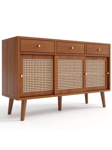 Retro-Design & hochwertige Details:Drei Schiebetüren mit Rattangeflecht verleihen eine natürliche, textile Optik.Warme Nussbaum-Optik (MDF) kombiniert mit goldfarbenen Metallbügelgriffen für einen eleganten Retro-Look.Massivholzbeine sorgen für Stabilität und einen natürlichen Akzent.Flexibler & organisierter Stauraum:Drei geräumige Schubladen für übersichtliche Aufbewahrung.Sechs Fachbereiche hinter den Türen mit höhenverstellbaren Einlegeböden (in 3-cm-Schritten) für maximale Anpassung.Glatte Schiebetür-Mechanik für platzsparende und komfortable Bedienung.Robuste Qualität & optimale Maße:Stabile MDF-Konstruktion mit einer hohen Tragkraft von 70 kg.120 cm Breite bei nur 40 cm Tiefe – schlank und platzsparend.20 cm hohe Beine ermöglichen Bodenreinigung und schaffen eine leichte Optik.Vielseitige Nutzung:Ideal als stylisches Sideboard im Wohn- oder Esszimmer, als Aufbewahrungslösung im Flur oder als funktionales Möbelstück im Home-Office.Passt zu Retro-, Mid-Century- und modernen Einrichtungsstilen.Ein Sideboard, das durch seine Materialkombination, flexible Innenaufteilung und zeitlose Eleganz besticht.