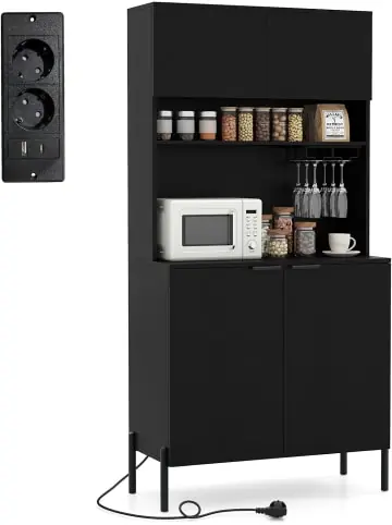 Beschreibung: Genießen Sie eine Kombination aus Eleganz und Vielseitigkeit mit diesem Küchenschrank. Die eingelassene Steckdosenleiste ermöglicht das gleichzeitige Aufladen mehrerer Geräte und verfügt über eine praktische Kabeldurchführung zur Kabelführung. Der Weinschrank bietet zur Optimierung des Stauraums eine offene Ablage und eine Arbeitsplatte für die Organisation wichtiger Utensilien. Das verstellbare Regal im Inneren lässt sich in 3 Positionen anpassen, um individuellen Stauraumbedürfnissen gerecht zu werden. Der integrierte Weinglashalter ist ideal zur Präsentation Ihrer Lieblingsgläser. Das Möbel steht auf stabilen Metallbeinen und ist mit Kippschutz-Kits für zusätzliche Sicherheit ausgestattet.Eigenschaften: Eingelassene Steckdosenleiste für verschiedene elektronische Geräte Breite Arbeitsplatte bietet reichlich Platz für Essenszubereitung oder Servieren Offenes Regal ideal zur Präsentation von Dekoration oder für häufig genutzte Gegenstände Oberschrank und Unterschrank bieten versteckten Stauraum für Besteck und Utensilien 3-fach höhenverstellbares Regal für flexible Aufbewahrung 2 Kippschutz-Kits für eine stabile Schrankmontage Robuste Metallbeine mit rutschfesten Fußpolstern für sicheren Stand Kabelführung hält Kabel ordentlich und organisiert Material: Plattenwerkstoff, MDF, Metall Gesamtmaße: 80 x 40 x 164 cm (L x B x H) Höhe offenes Regal: 15,5 cm 2 Steckdosen: 230V/12 A 1 USB-Anschluss & 1 Type-C Anschluss: 5 V, 2,4 A Kabellänge: 145 cm Tragfähigkeit Arbeitsplatte: 40 kg Tragfähigkeit offenes Regal: 15 kg Tragfähigkeit Regal im Unterschrank: 20 kgLieferungsumfang: 1 x Vorratsschrank 1 x AnleitungAchtung! Die Lieferung umfasst 2 Pakete, die nicht notwendigerweise mit demselben Spediteur verschickt werden und nicht unbedingt zur gleichen Zeit ankommen.