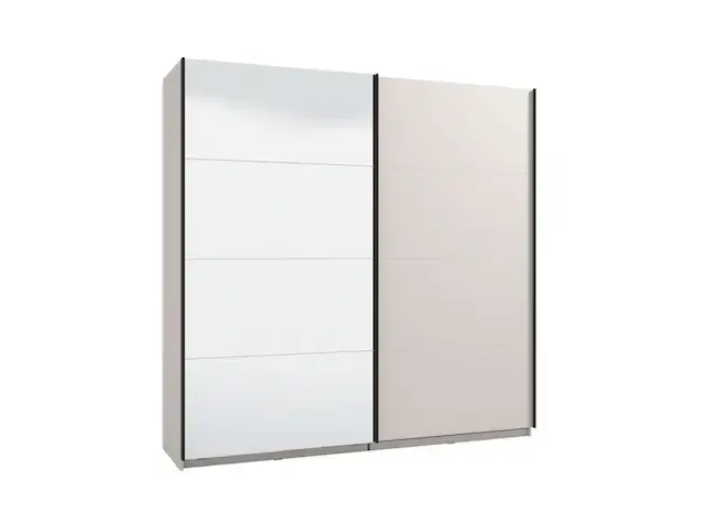 3 individuelle Innenausstattungen: Basic, Classic oder Comfort für Deine Bedürfnisse und Ordnung im Schrank. Basic: mit 2 Kleiderstangen und 2 Einlegeböden. Classic: mit 2 Kleiderstangen und 5 Einlegeböden. Comfort: mit 2 Kleiderstangen, 2 Einlegeböden und 1 Wäscheeintteilung mit 1 kleiner Kleiderstange, 2 Schubladen und 3 kleine Einlegeböden. Cashmere kombiniert mit Glas-die neue Trendfarbe sorgt für Glanz, Frische und Leichtigkeit in Deinen Räumen