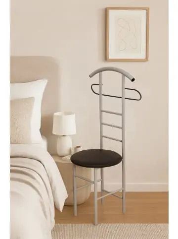 Toller Herrendiener für den Ankleideraum oder das Schlafzimmer…Praktisch: dieser Herrendiener dient auch gleichzeitig als Sitzgelegenheit. Gestell aus Stahlrohr, weiß pulverbeschichtet, Sitzfläche schaumstoffgepolstert und mit einem pflegeleichten Kunstlederbezug (100% Polyvinylchlorid), schwarz, bezogen. Maße ca. cm: B. 53 x H. 118 x T. 47 cm. Sitzhöhe ca. 48 cm.- Mit Hosenhalter- Mit Blusen-/Hemdenbügel- Mit bequemer Sitzfläche