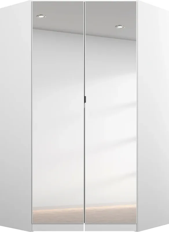 Eckkleiderschrank mit Spiegeltüren. Viel Stauraum. Kleiderstange und Beschläge aus Metall. Schenkelmaß 117×104 cm. Made in Germany!