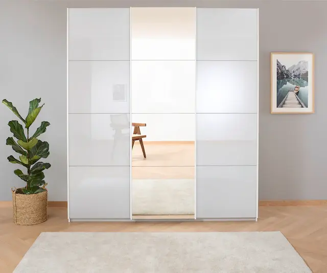 2 Einlegeböden und zwei einzelne Schubkästen in der Höhe variabel positionierbar. In verschiedenen Breiten, Materialien und Höhen erhältlich. Fachböden und Kleiderstangen können individuell eingesetzt werden und in der Höhe verstellt werden. Rauch Easy-Slide-Funktion für ein sanftes, leises Öffnen der Schwebetüren. 100% Made in Germany, ausgezeichnet mit dem Blauen Engel und dem Goldenen M