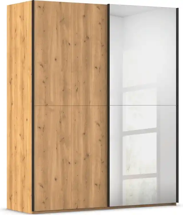 Moderner Schwebetürenschrank mit edler Front in massiver Asteiche sowie Spiegel. Eyecatcher: Massive Türen senkrecht geteilt, mit waagrechter optischer Nut. Kleiderschrank mit Metallgriffleisten im passend ausgewählten Farbton. Fachböden und Kleiderstangen im Kleiderschrank können individuell eingesetzt und in der Höhe verstellt werden. 100% Made in Germany, ausgezeichnet mit dem Blauen Engel und dem Goldenen M