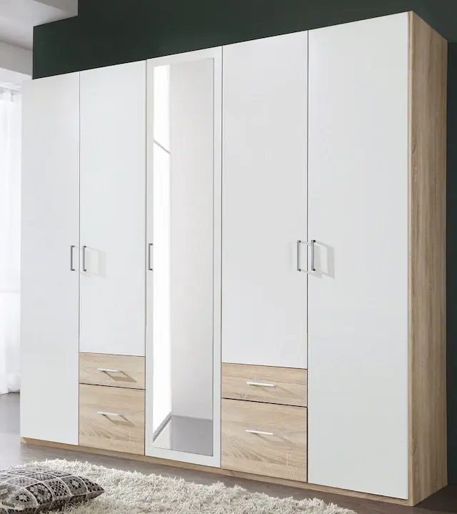 Viel Stauraum durch jeweils 4 Schubkästen. Mitteltüren mit Spiegeln. In 4 Farben und 2 Breiten. Tiefe/Höhe: 58/210 cm. Extrakurze Lieferzeit für die Dekore: struktureichefb. hell/weiß und weiß