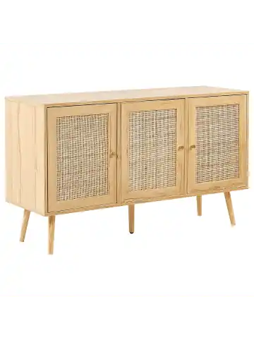 Sideboard mit 3 Rattan-Türen. Dieses Sideboard ist eine moderne, platzsparende Ergänzung für jedes Wohnzimmer, jeden Flur oder jedes Schlafzimmer. Ausgestattet mit drei Türen, bietet es reichlich Stauraum für Bücher, Dokumente, zusätzliche Wäsche sowie Platz für Dekorationsgegenstände auf der Abstellfläche. Der helle Holzton passt zu allen Räumen, während die Türen mit Rattangeflecht einen Hauch von Boho-Stil vermitteln. Das Möbelstück besteht aus Span- und MDF-Platten, während die Beine aus Kiefernholz gefertigt und mit Schutzkappen versehen sind.Details: Typ: Sideboard Stil: Mediterran Farbe: Braun Material: Rattan Zusätzliches Material: MDF-Platte Gestellmaterial: Holz Türöffnungsarten: Standard Schubladen: Nein Finish: Melamin Türanzahl: 3 Regalböden: JaDimensions: Tiefe: 40 cm Breite: 120 cm Höhe: 71 cm Gewicht: 24 kg Max. Belastung der Oberplatte: 90 kgSie kaufen: 1 x SideboardProduktvorteile: Holzähnliches Finish für einen möglichst naturnahen Look, Passt ausgezeichnet zu vielen Einrichtungsstilen, Robustes Gestell, Grosszügiger Stauraum, Schutzkappen zum Schutz des BodensMontage: Nicht montiert. 45 – 60 Min.Pflegeanleitung:Rattan: 1.Die Reinigung sollte ausschließlich mit einem weichen, trockenen Tuch und ohne Reinigungsmittel erfolgen.MDF-Platte: 1.Bitte ausschließlich milde Reinigungsmittel und weiche Tücher verwenden. Feuchte Stellen sofort trocken reiben.