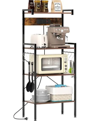 Beschreibung: Verwandeln Sie Ihren Raum mit unserem vielseitigen Bäckerregal! Mit einer eingebauten Steckdose bietet es eine praktische Lösung, um Geräte wie Mikrowellen, Kaffeemaschinen oder Toaster mit Strom zu versorgen. Das 4-stufige Küchenregal verfügt über ein oberes Regal, eine geräumige Arbeitsplatte, 2 untere Regale und 8 abnehmbare S-Haken, die reichlich Stauraum für Utensilien, Küchengeräte, Vorräte und mehr bieten. Gefertigt aus einem robusten Metallrahmen und dicken Brettern bietet der Kaffeebartisch außergewöhnliche Haltbarkeit und starke Unterstützung. Er ist auch mit verstellbaren Fußpolstern für Stabilität auf unebenen Böden und 2 Anti-Kipp-Sets für zusätzliche Sicherheit ausgestattet. Das rustikale Industriedesign fügt sich nahtlos in jeden Raum ein und dient als Kaffeestation, Mikrowellenständer, Aufbewahrungsregal oder sogar als Pflanzenständer.Eigenschaften: Praktische eingebaute Steckdosenleiste zum Stromversorgen von Küchengeräten Oberes Regal, geräumige Arbeitsplatte und 2 untere Regale halten Ihre Küche ordentlich 8 abnehmbare S-Haken zum Aufhängen von Utensilien, Handtüchern oder anderen Küchenutensilien Robuster Metallrahmen und dicke Bretter bieten zuverlässige Unterstützung Verstärkte X-Streben und 2 Anti-Kipp-Sets für erhöhte Stabilität und Sicherheit Verstellbare Fußpolster halten das Regal auf unebenem Boden stabil Materialien: Metall, Holzwerkstoff Gesamtmaße: 59 x 34 x 136 cm (L x B x H) Max. Belastung des oberen Regals: 25 kg Max. Belastung jedes unteren Regals: 36 kg Max. Belastung jedes Hakens: 2 kg 2 AC-Steckdosen: 220-250V/16A Länge des Stromkabels: 150 cm Netto-Gewicht: 11,5 kgLieferungsumfang: 1 x Küchenbäckerregal 8 x Haken 1 x Anleitung