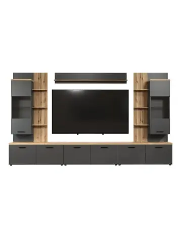 Baggio Regalsystem 6 Teile Antracit. 3x TV Lowboard je Stück: B/H/T: 120 / 50 / 40 cm; 2x Hängeregal je Stück: B/H/T: 80 / 161 / 32 cm (Hängervitrine 48/161/32 cm, Regal 32 / 161 / 20 cm); 1x Wandregal: B/H/T: 167 / 25 / 18 cm. FSC-K 70%. TV, max: 75″. Exkl. Beleuchtung.