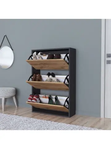 Schuhschrank Der moderne Schuhkipper verfügt über drei Kipptüren und bietet Ihnen die ideale Lösung zur platzsparenden Aufbewahrung Ihrer Schuhe. Mit seinem ansprechenden Design wird er zum Blickfang in jedem Raum. Im Inneren des Schranks finden Sie ausreichend Platz, um Ihre Schuhkollektion ordentlich und geordnet aufzubewahren. Sein stilvolles Design und die praktische Funktionalität machen ihn zu einer vielseitigen Lösung für jeden Schuhliebhaber. Entdecken Sie mit unserer Schuhkommode eine neue Art der Schuhaufbewahrung, die Ihren Schuhen das perfekte Zuhause bietet und gleichzeitig einen Hauch von Luxus in Ihren Raum bringt. Lassen Sie sich von seiner Eleganz verzaubern und genießen Sie die Ordnung und Übersichtlichkeit, die er Ihnen bietet. Produkt-Highlights: – Ideal zum platzsparenden verstauen Ihrer Schuhe – 3 geräumige Aufbewahrungsfächer – Jedes Fach mit mittlerer Trennwand – Platz für bis zu 18 Paar Schuhe – Schneller und einfacher Aufbau Material: Spanplatte Farbe: – Korpus: Anthrazit – Türfront: Eiche Maße: – Gesamt (HxBxT): 110 x 73,5 x 24 cm – Türfront pro Fach (HxB): je 33 x 70 cm Lieferumfang: 1 x Schuhschrank Markenware aus dem Hause: [en.casa]
